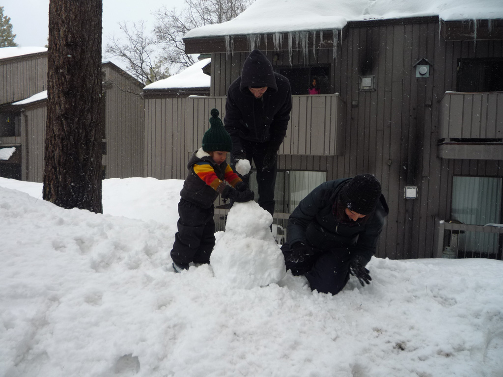 Papa prépare une grosse boule pour faire un bonhomme de neige.